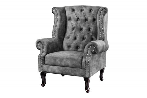 Der Wing Chair CHESTERFIELD in elegantem Grau im antiken Design ist eine stilvolle Bereicherung für jedes Wohnambiente. Die weiche Velvet-Oberf...