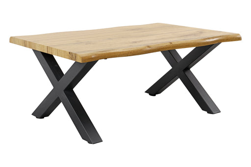 Der **Couchtisch Untamed** mit einer Tischplatte von 30mm Dicke in Wildeiche Optik und stabilen X-Beinen in schwarzem Metall ist eine perfekte Ko...