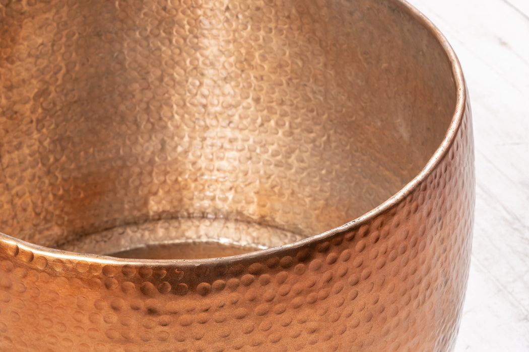 Der Couchtisch Eastward II in Kupfer kombiniert orientalisches Design mit moderner Eleganz. Die glänzende Hammerschlag-Optik macht ihn zu einem besonderen Blickfang in jedem Raum.