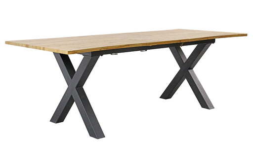 Vollständige Details anzeigenEsstisch Untamed Tischplatte 25mm X-Beine Wildeiche Optik natur ausziehbar