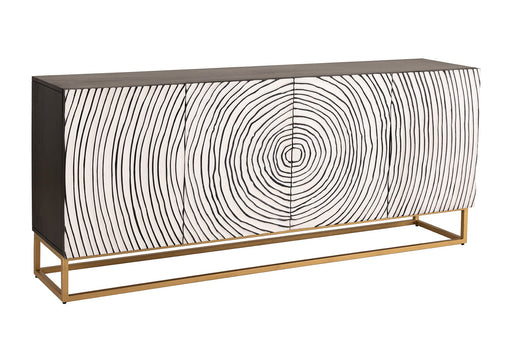 Das Sideboard Val Müstair kombiniert modernes Design mit eleganter Funktionalität. Die schwarze und weiße Farbkombination und die goldfarbenen ...